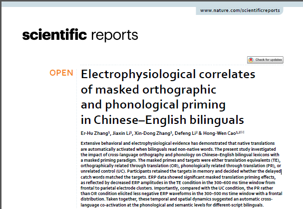 曹洪文老师团队在英国Nature出版集团(NPG)旗下综合性科学期刊《Scientific reports》(MULTIDISCIPLINARY SCIENCES, SCIE, IF:4.996, Q2)上在线发表题为“Electrophysiological correlates of in Chinese–English bilinguals”的研究论文。该论文第一作者为百家乐在线游戏
