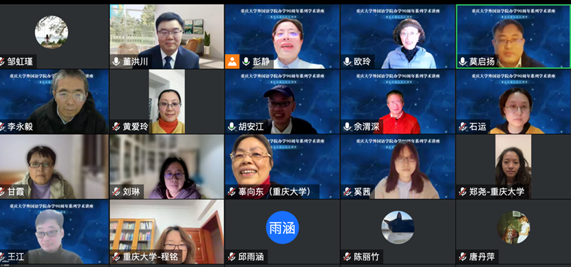邀请四川外国语大学校长董洪川教授在云端讲座,讲座的题目是《外语科研创新与学术写作漫谈》。此次讲座是讲座重庆大学办学90周年系列学术讲座之一,由彭静教授主持,吸引了百余位校内外师生参与。董校长就新时代外语学科科研的主要问题,外语学科学术创新的路径与方法,研究范式转换与学术创新、学术论文写作与发表等问题发表了深刻见解。