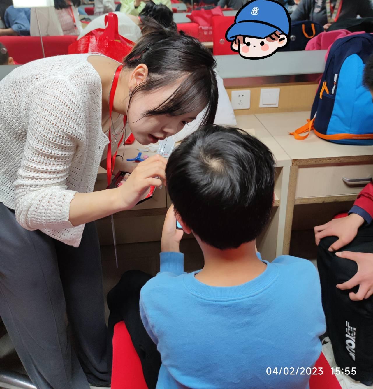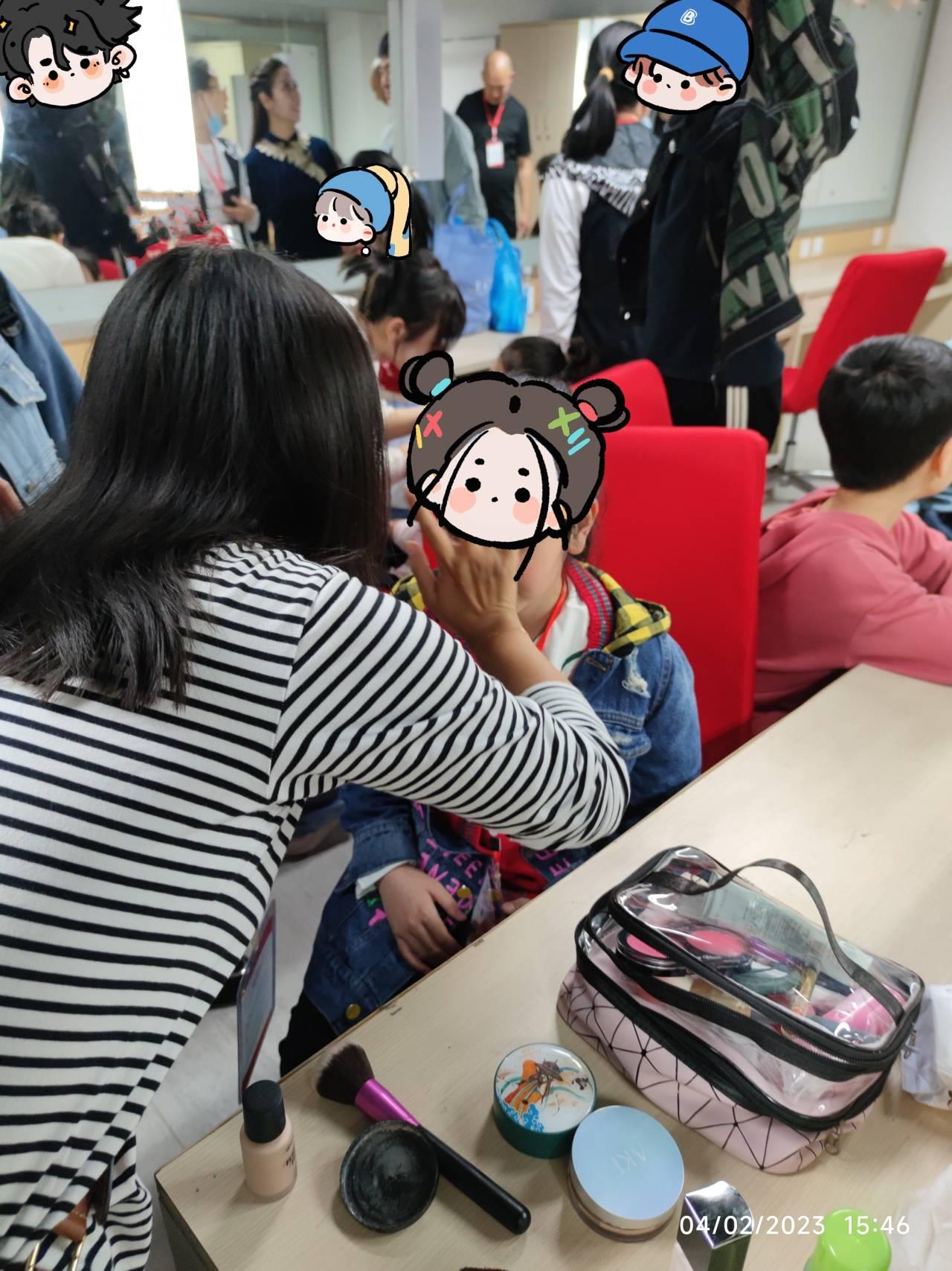 在与重庆市渝中区汇爱社会工作服务中心理事长唐毅教授沟通后,康鑫团队成员于4月2日下午3点到达国泰艺术中心为汇爱星星合唱团及重庆慧灵非洲鼓队的小朋友们和家长化妆。7位志愿者用亲切温和的话语引导小朋友耐心等待,用精湛熟练的化妆技艺将小朋友们和家长打扮得英俊美丽,化妆过程推进得顺利、有条不紊,化妆成果得到了家长们的一致好评。