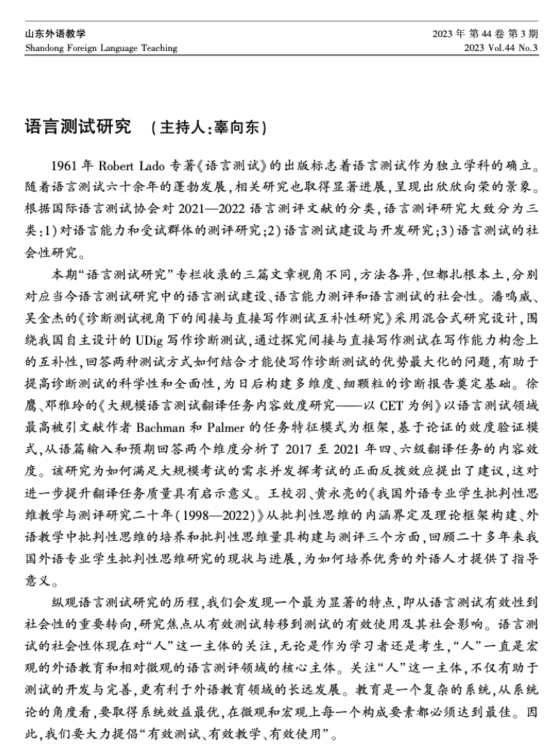 学报》第46卷第5期与北大核心期刊《山东外语教学》第44卷第3期“语言测试”专栏的主持人。作为外语界广受赞誉的两本专业学术期刊,邀请辜向东教授担任“语言测试”专栏的主持人,旨在以辜向东教授的语言测试专业知识和研究成果为引领,推动这一领域的学术交流、传播与进步。这也是辜向东教授第二次受邀担任《解放军百家乐在线游戏