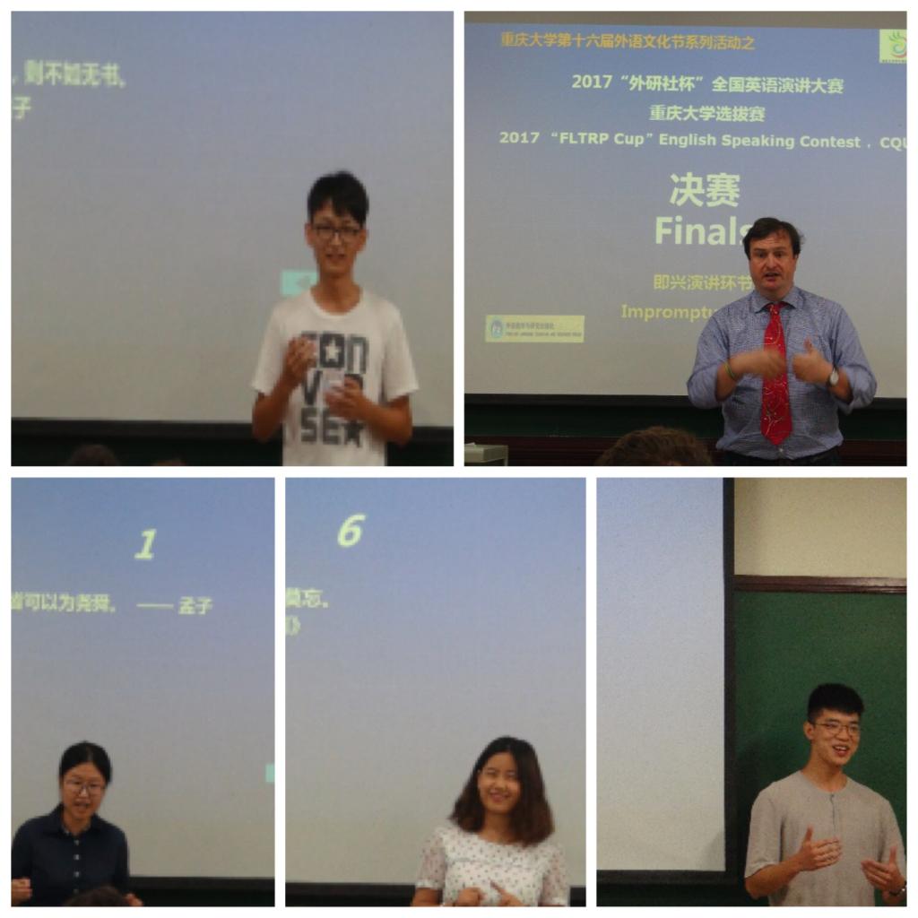 大学外语教育中心自2017年6月启动大学英语演讲、写作、阅读英语能力竞赛,并于2017年9月14日下午举办了重庆大学2017年大学英语演讲、写作、阅读大赛暨“外研社杯”重庆大学选拔赛。