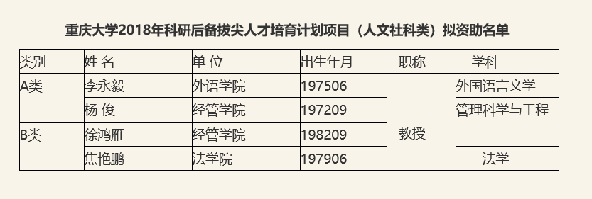 2018年5月30日,重庆大学2018年“科研后备拔尖人才培育计划”项目(人文社科类)评审结果公示:立项资助指标为4项(A类人才、B类人才各2个资助指标),基地专职研究员李永毅教授获得其中的A类人才立项资助。