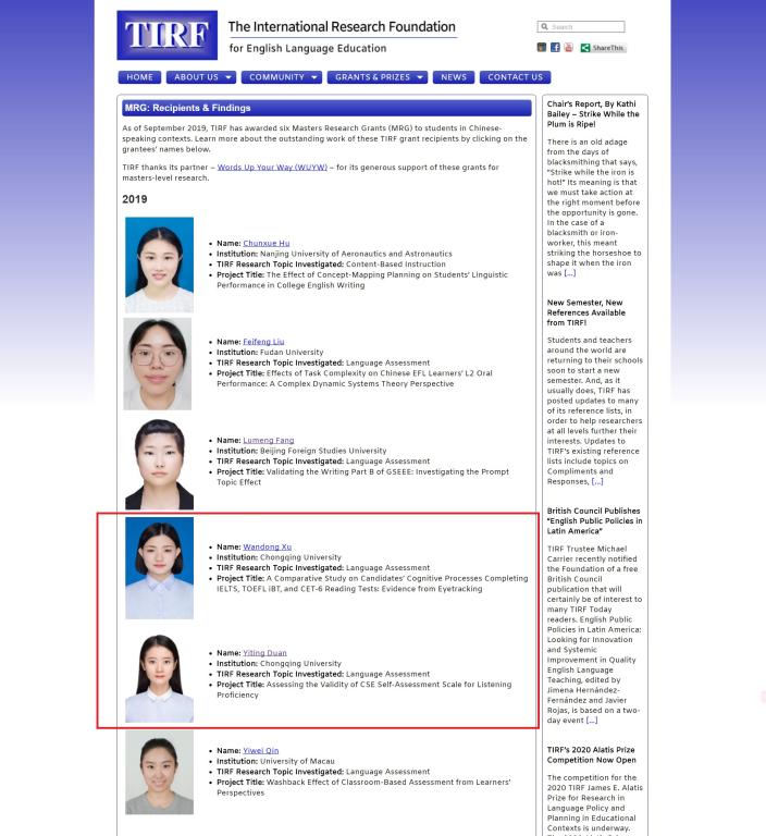2019年9月24日,首届“国际英语教育研究基金会硕士研究基金奖”(The International Research Foundation for English Language Education, Masters Research Grants, TIRF MRG)获奖名单正式揭晓。此次共计六名获奖者,百家乐在线游戏