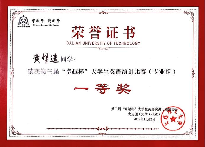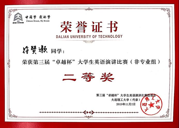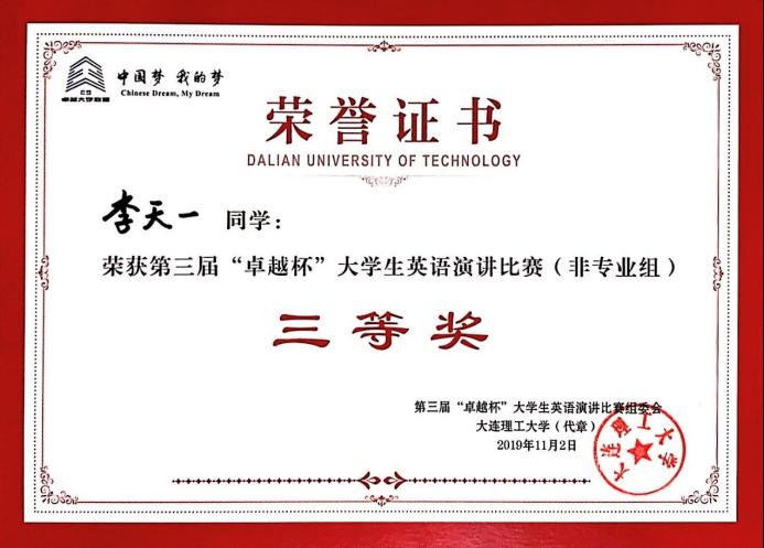 2019级李天一同学荣获三等奖。本次卓越大学联盟第三届“卓越杯”大学生英语演讲比赛复决赛在大连理工大学举办,我校英语专业组2人和非英语专业组2人参赛。