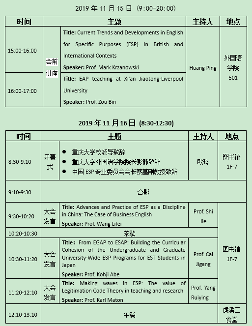亚洲ESP学会第三届年会暨全国第八届专门用途英语研讨会会讯 (15-17 November 2019 Chongqing University, China)
