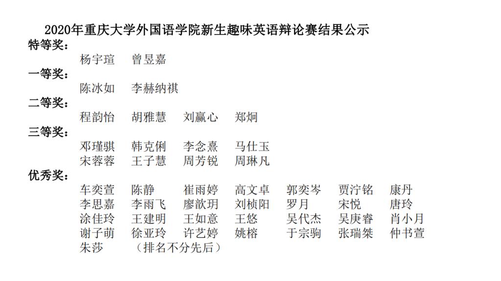 经过激烈的比拼后,新生英语辩论赛的比赛结果最终公示如下,