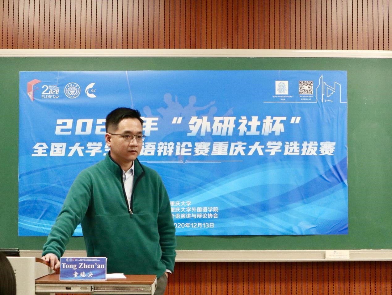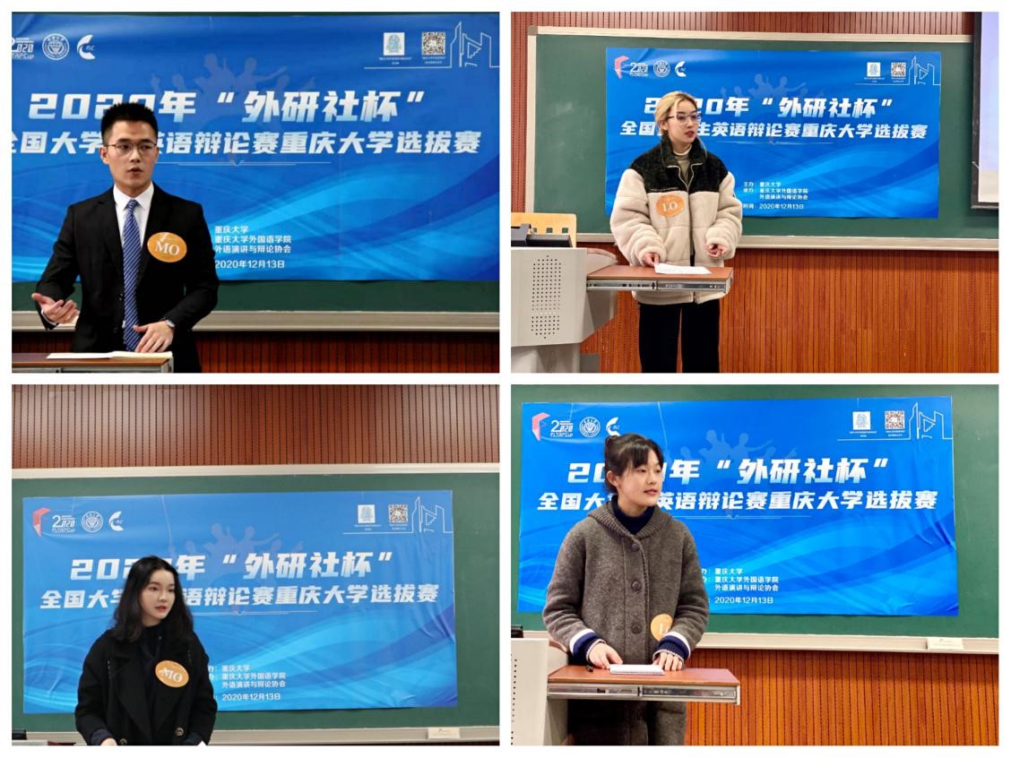2020年12月13日,2020年“外研社杯”全国大学生英语辩论赛重庆大学校园选拔赛在重庆大学虎溪校区第一教学楼D1327-D1330教室顺利举办。本次大赛共吸引了全校来自不同专业、年级同学组成的56支队伍参赛。大赛分为初赛、复赛、决赛三个赛段,采用BP赛制(英国议会制),每轮有4支辩论队出场,正反方分别由2支队伍构成,并分别发表开篇陈词和总结陈词。